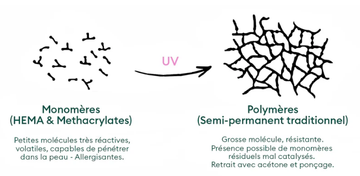 Pour obtenir cette brillance longue durée, les vernis semi-permanents traditionnels contiennent des monomères de méthacrylates. Sous l’effet des UV, ces molécules se transforment en polymères, formant une couche plastique dure et résistante.