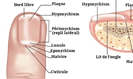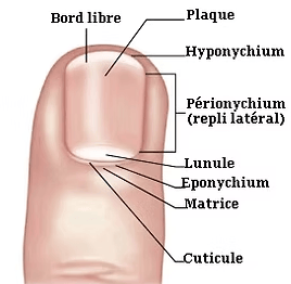 Lit de l’ongle ou lit unguéal : peau très fine assurant l'adhérence des plaques de kératines qui ont pour but de la protéger.