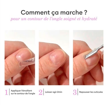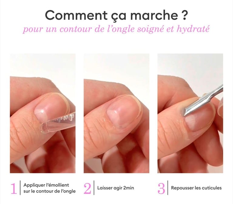 Lors d’une manucure, l’application d'un émollient (crème adoucissante) permet de ramollir les cuticules avant de les repousser en douceur. Cela facilite l’élimination de l’excès de peau sans risque de les abîmer.